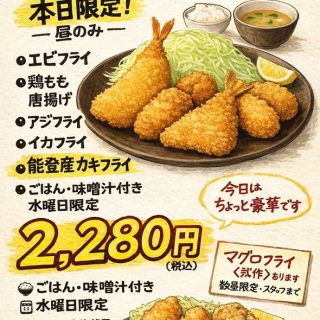 曜ミックスフライDAY 本日限定・昼のみ! 2026/01/07 曜ミックスフライDAY 本日限定・昼のみ! 今日は 「ちょっと豪華」です ・エビフライ ・鶏もも唐揚げ ・アジフライ ・イカフライ ・能登産 カキフライ 揚げたてサクサクの ミックスフライを一皿に盛り込みました! ごはん・味噌汁付き 2,280円(税込) さらに… マグロフライ〈試作〉 数量限定でご用意しています (気になる方はスタッフまで) ※水曜日は昼営業のみ ※売り切れ次第終了 #とんかつぼたん #水曜ミックスフライDAY #ミックスフライ #能登カキ #今日はちょっと豪華 #東松山ランチ #揚げ物好き #数量限定 関連Webコンテンツ一覧・他にも以下がよく読まれています 明日5月19日 火曜日お… 飛沫対策アクリル板 新し… 埼玉県飲食店+ に加えて C… 「とんかつぼたん父の日ス… 生しらす(大阪湾産)が入… 明日9月12日 火曜日お… 明日お魚dayやります💕 2つの名産地から選べるカ… 明日1月30日火曜日お魚… 夜もまだまだお魚DAYやり… 明日のお魚dayは開催決定… 7月29日(火)は「お魚DAY」…