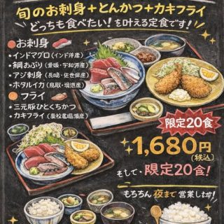 2月10日(火) 火曜日恒例 お魚DAY 開催中です! 2026/02/10 今日は 旬のお刺身+とんかつ+カキフライ 「どっちも食べたい!」をしっかり叶える定食 お刺身 ・インドマグロ ・鯛あぶり ・アジ刺身 ・ホタルイカ フライ ・三元豚ひとくちかつ ・奥松島鳴瀬産 カキフライ ご飯・キャベツ・おしんこ・味噌汁 1,680円(税込) 限定20食です! そして… もちろん夜まで営業してます! お仕事帰りにもぜひどうぞ とんかつぼたん https://www.tonkatsu-botan.com/ #とんかつぼたん #火曜日お魚DAY #本日限定 #刺身ととんかつ #カキフライ #おかわり自由 #夜も営業 関連Webコンテンツ一覧・他にも以下がよく読まれています 本マグロ 紀伊長島産 明… 本日は誠に勝手ながら 売… 明日12月14日 火曜日… 本日火曜日お魚DAYメニュー 2023年営業終了です 鯵たくさん釣ってきます 本日のおすすめは壱岐長島… 数量限定!能登産カキフラ… **営業スケジュールのお知… 本日1月21日(火曜日)限定… 毎週火曜日恒例!お刺身&… 本日11月5日(水)は \水曜…